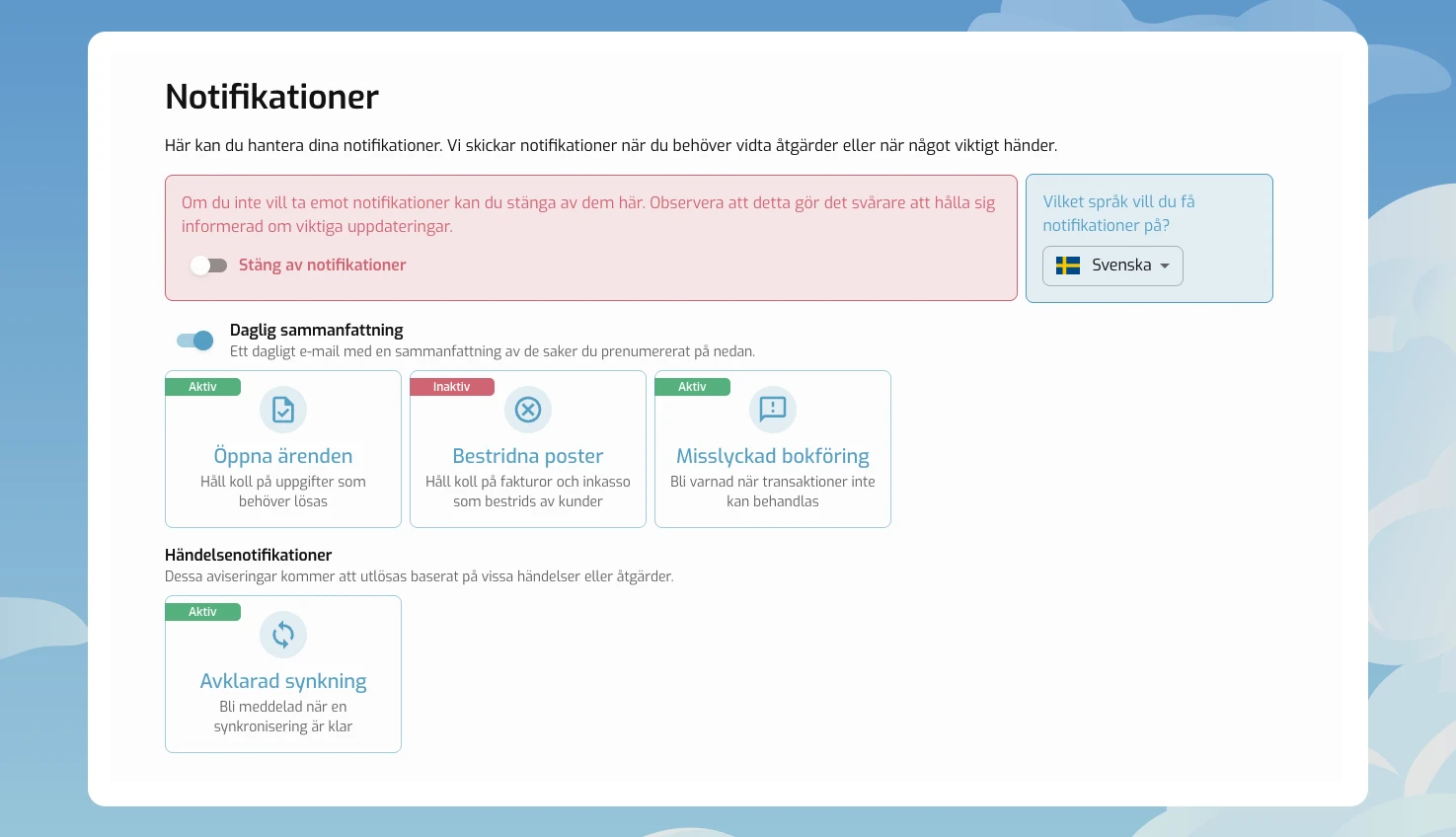 Händelsenotifikationer är notiser som skickas när en händelse har utförts, exempelvis när en fakturasynk är avklarad. Notifikationerna skickas ut via e-post, och du väljer själv vilken typ av notifikationer som du vill ha.